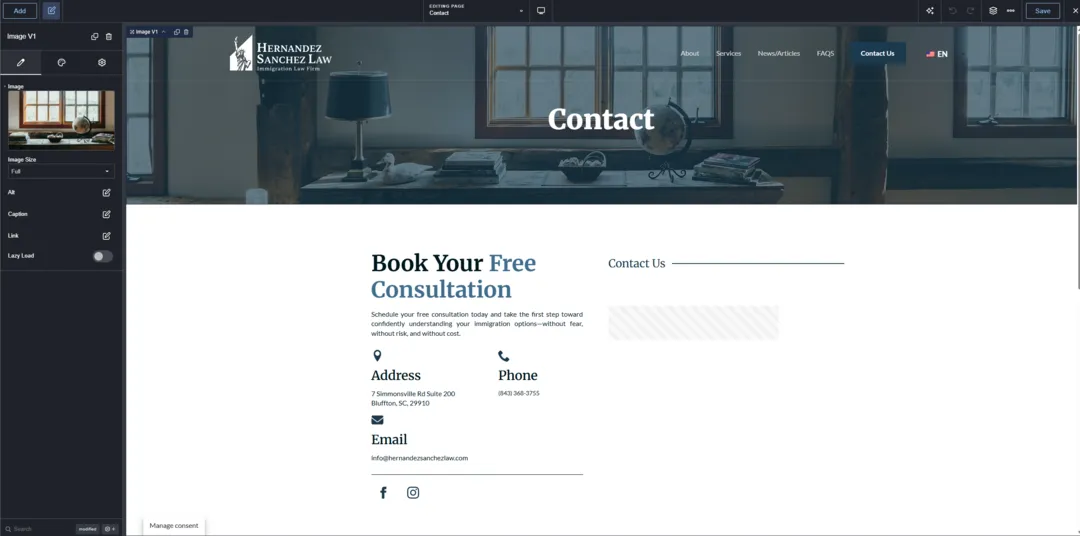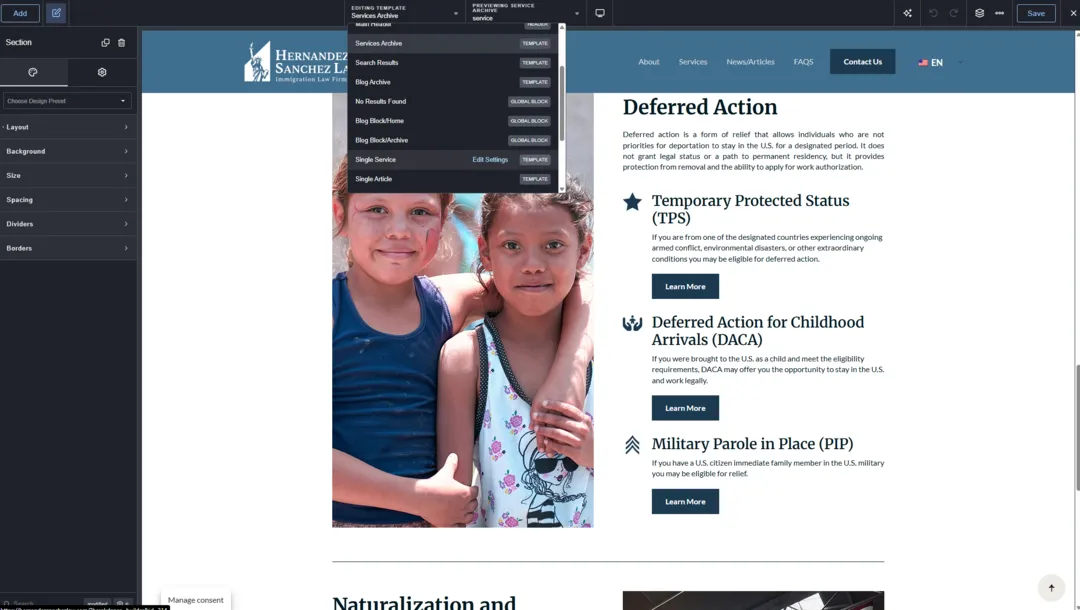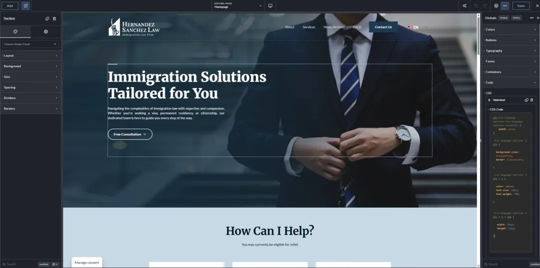 For the site build, I of course used WordPress alongside the Breakdance page builder — my go-to combo for creating fully custom, responsive designs. The biggest challenge at this stage was striking a balance between the traditional, corporate feel expected from a law firm and a more modern, refreshed design language. Most law firm websites in general feel like they haven’t changed since the early 2000s — cluttered layouts, outdated fonts, and uninspiring visuals. I wanted Hernandez Sanchez Law to stand out as modern, clean, and credible — without being too cold or generic.