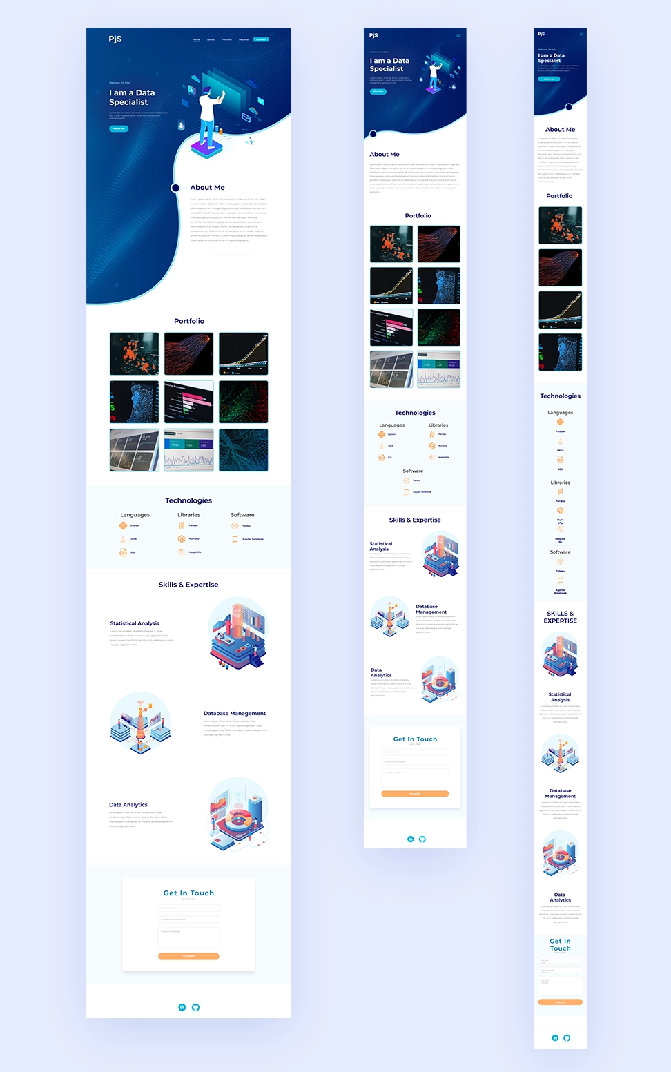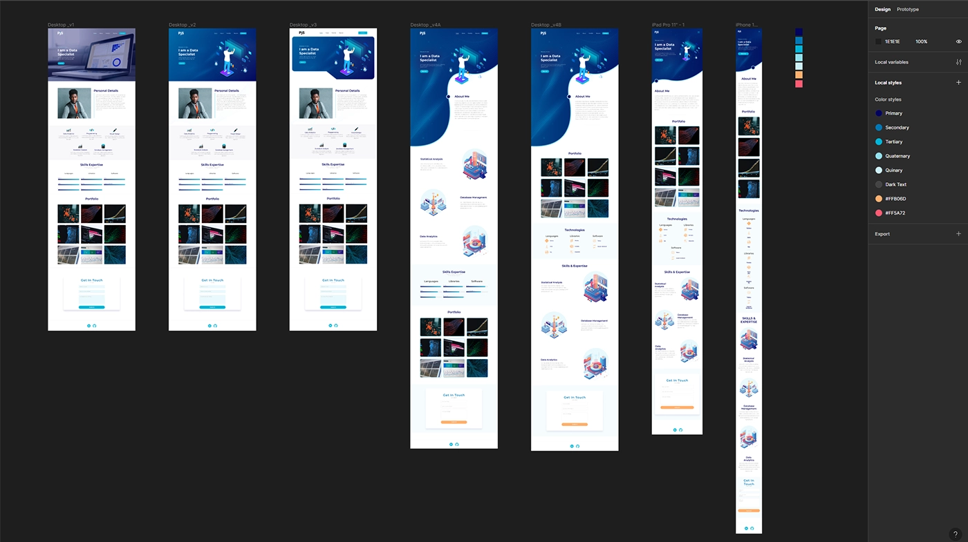 I first researched different Data Specialist portfolios to find a common trend among them in terms of page layout and sitemap architecture. It was a pretty simple scheme: Home, About, Portfolio, Skills, and Contact. I decided to keep this portfolio nice and simple and make it a single page site.